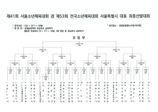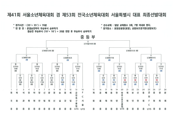 제41회 서울소년체육대회 겸 제53회 전국소년체육대회 서울특별시대표 최종선발대회 (대진표) 페이지 정보 작성자 최고관리자 조회3,672회 작성일 24-03-13 16:40 본문 남자 U13세 이하부 / 남자 U16세 이하부 이전글2024 제41회 서울소년체육대회 겸 제53회 전국소년체육대회 서울시대표 최종선발대회[중등부](우승-문래중/준우승-목동중) 24.03.29 다음글2023 서울특별시축구협회장배 축구대회[초등부](우승-FC난우/준우승-K리거강용FC) 23.12.05 목록