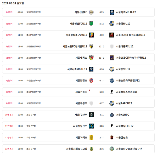 성동스포츠클럽, 솔트축구클럽U12, 송파유소년축구단, 신답FCU12, 신암FC, 유석U12, 은평구U12, 중랑축구단U12, 최강희축구교실, 충암U12, 태풍FCU12, 화랑U12