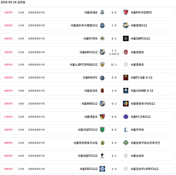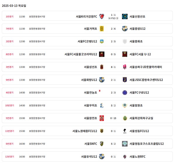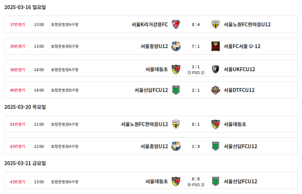 joinkfa.com -> 리그/대회 -> 검색창 (서울소년체육대회) 검색 -> [초등부]제42회 서울소년체육대회 겸 제54회 전국소년체육대회 서울시대표선발대회[남자U13세이하부] -> 일정결과